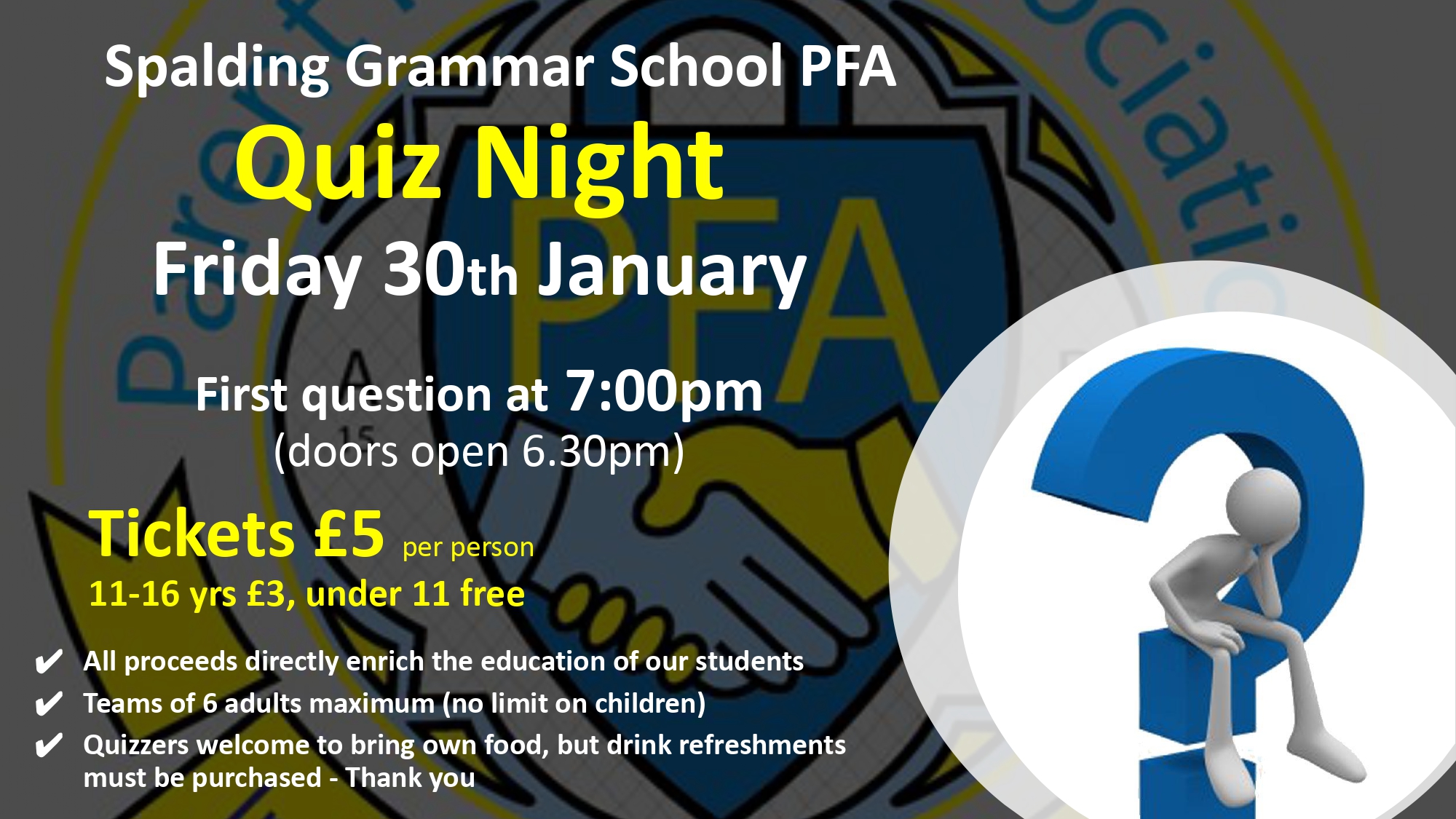 Join us on Friday 30th January for the next PFA quiz night.
